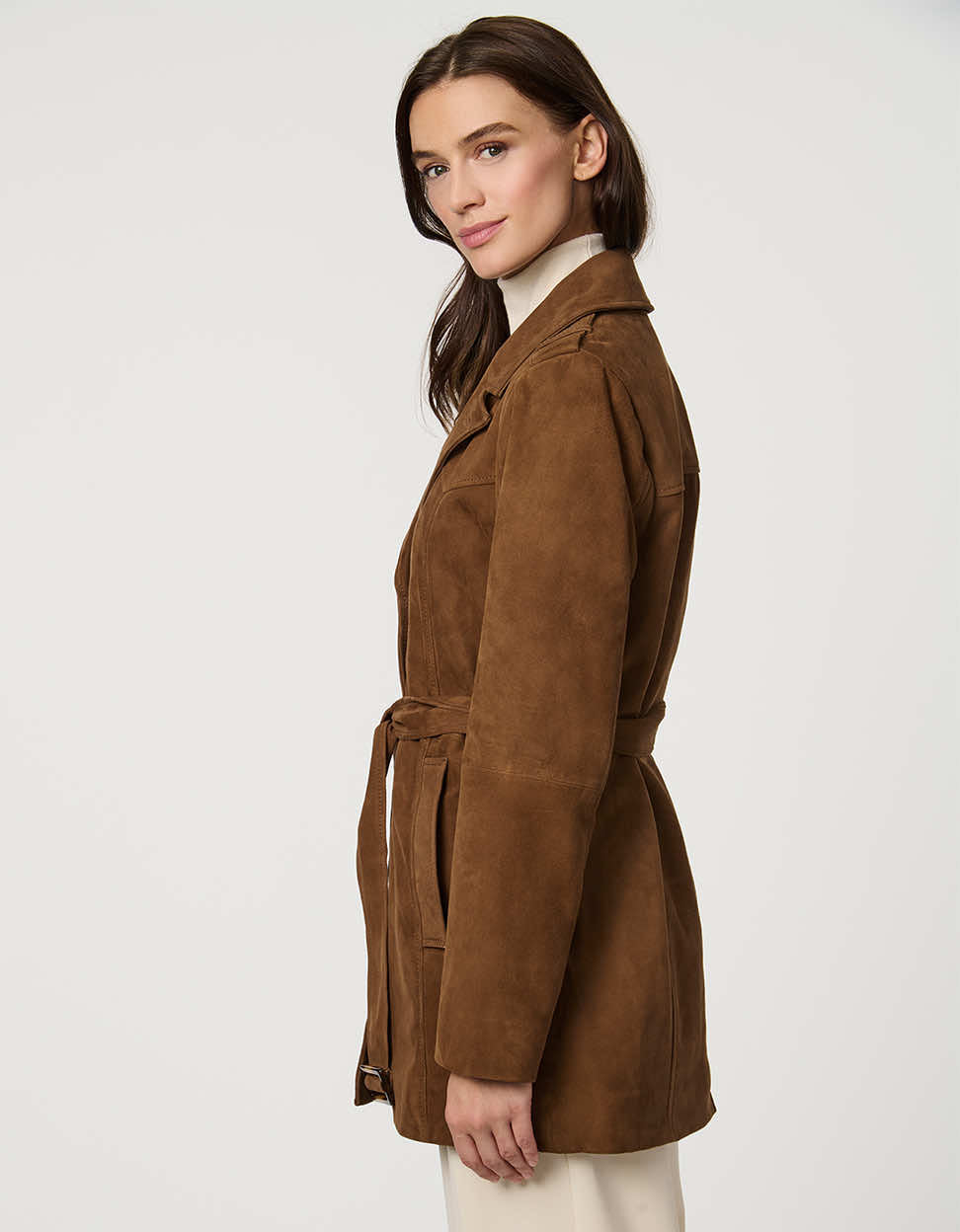 A modern twist on the trench, The Radcliffe is a suede trench coat for women with relaxed structure and timeless details. Featuring a belted waist, epaulettes, and double-breasted design, it’s an effortlessly chic suede coat that pairs polish with ease.