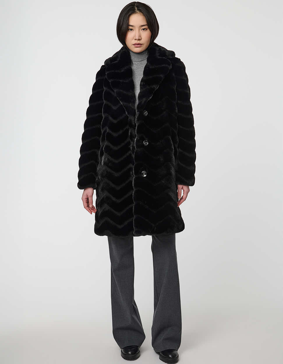Add angles to your look with the tonal zigzag seams on this vegan-fur coat, accented with slanted hand pockets. Oversized for room to move and layer throughout fall and winter, this mid-length piece of outerwear adds a retro-groovy flair to the classic faux-fur coat.