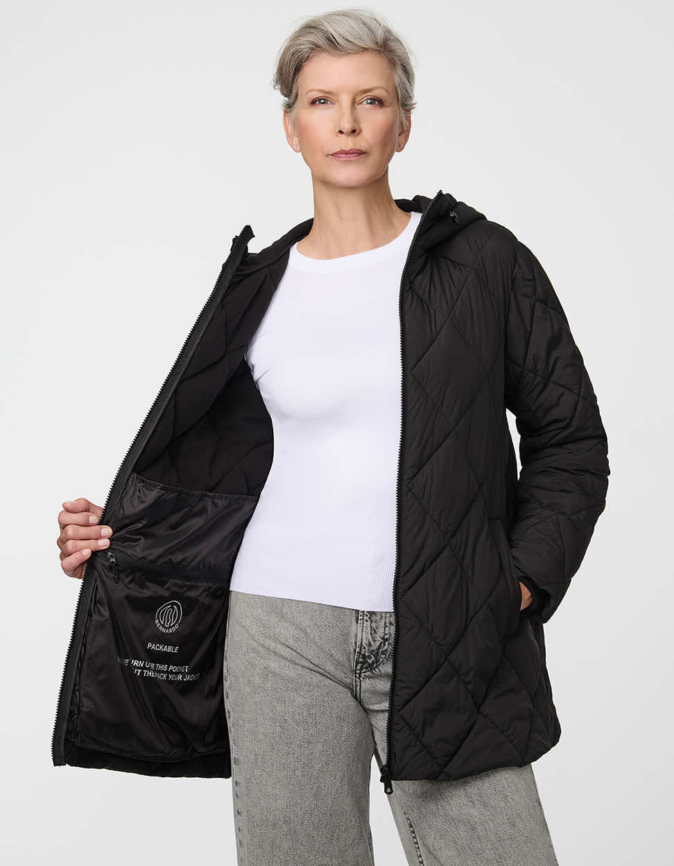 Stay cozy and eco-conscious in the Avery Puffer, a thigh-length, oversized puffer jacket with fleece lining and diamond quilting. Made with Ecoplume™ insulation, this water-repellent, lightweight coat is packable, breathable, and built for modern comfort.