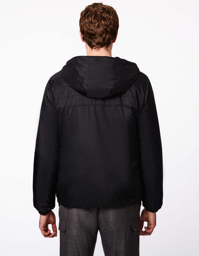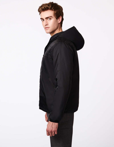 Two chest pockets and two hand pockets come with zipper styling on the men's black puffer jacket. Sleek in front and quilted at the yoke, stay warm in this winter coat thanks to the Ecoplume™ insulation, a heat-keeping, sustainable filler that’s made from 100% recycled post-consumer plastic bottles.