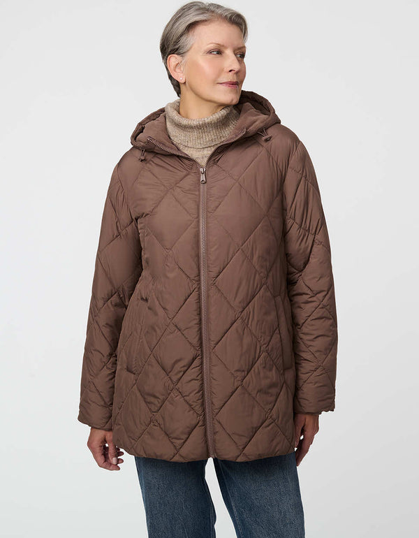 Shop The CollectionStay cozy and eco-conscious in the Avery Puffer, a thigh-length, oversized puffer jacket with fleece lining and diamond quilting. Made with Ecoplume™ insulation, this water-repellent, lightweight coat is packable, breathable, and built for modern comfort.