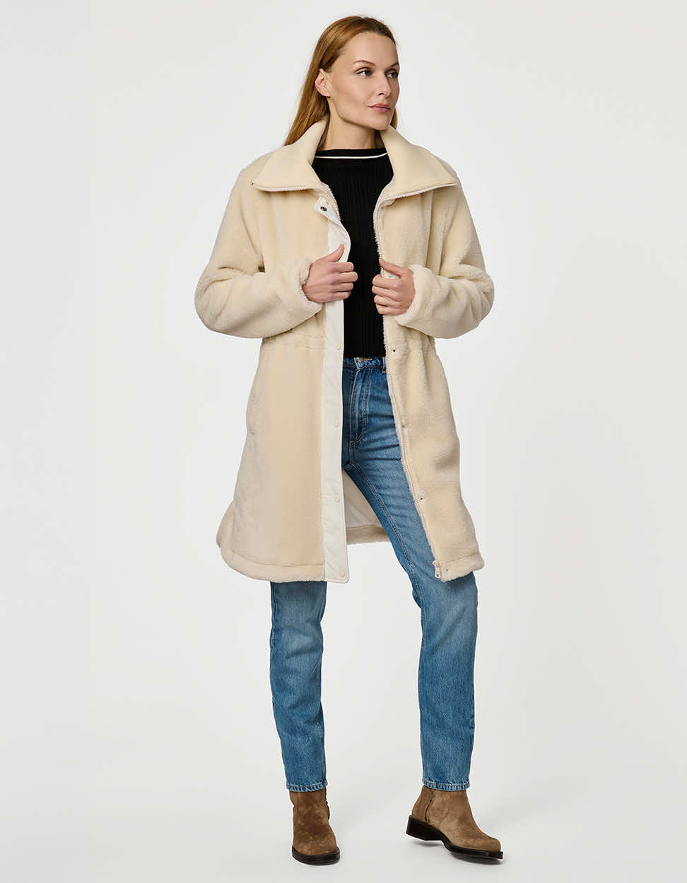 Sculptural yet soft, a faux fur style that wraps you in plush sherpa warmth. The Briarfield Sherpa Anorak features a zip-up collar and cinched waist define the silhouette, while a shirt-tail hem and welt pockets bring modern shape to this cozy-meets-polished essential.