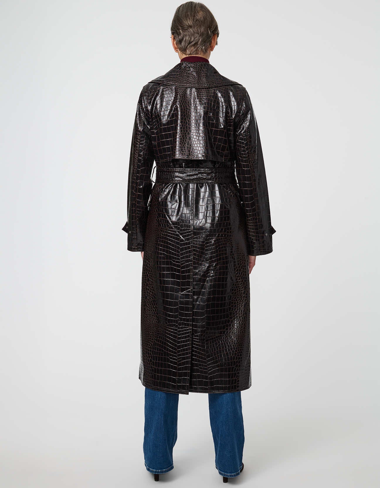 A striking take on a classic silhouette, this trench coat features rich faux crocodile leather with a structured, timeless fit. The calf-length design offers polished coverage, while large lapels and flap pockets add timeless details. Double-breasted with a belted waist, it combines sharp tailoring with effortless style—perfect for elevating your look from day to night.