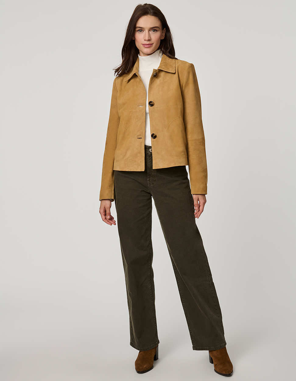 Polished and timeless, The Corbin Jacket is a women’s suede jacket with a streamlined silhouette. Designed with a single-breasted front, oversized buttons, and a crisp collar, it’s a refined outerwear layer that delivers subtle sophistication for every season.