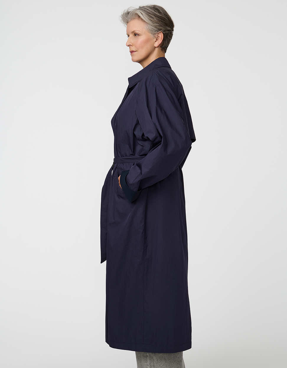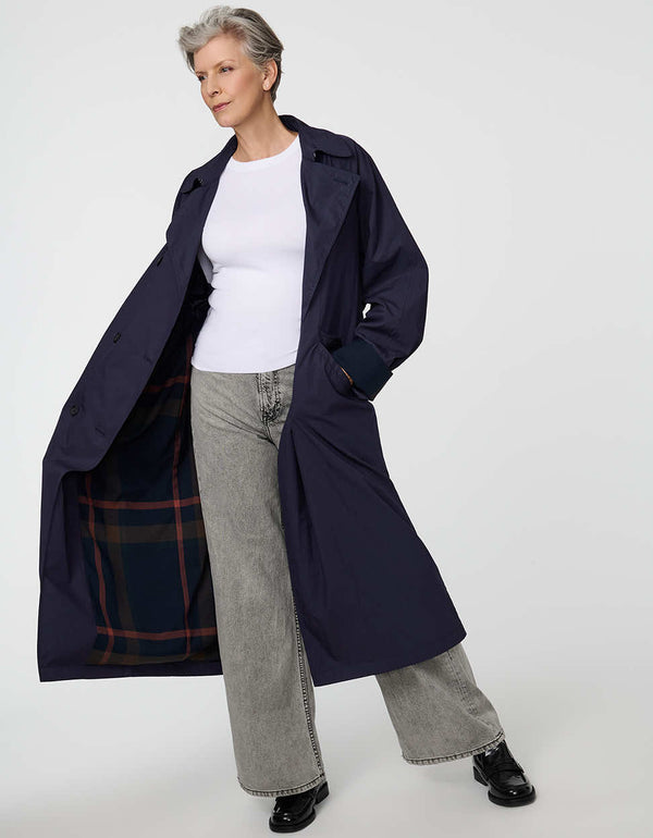 Elevate your wardrobe with the Kingston Trench Coat—a long, double-breasted trench coat with large lapels and a plaid-lined turn-back cuff. Its water-repellent finish and refined silhouette make it a versatile staple for work or weekend wear.