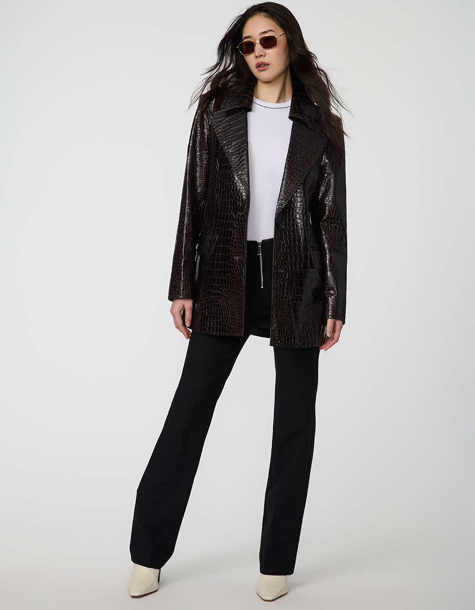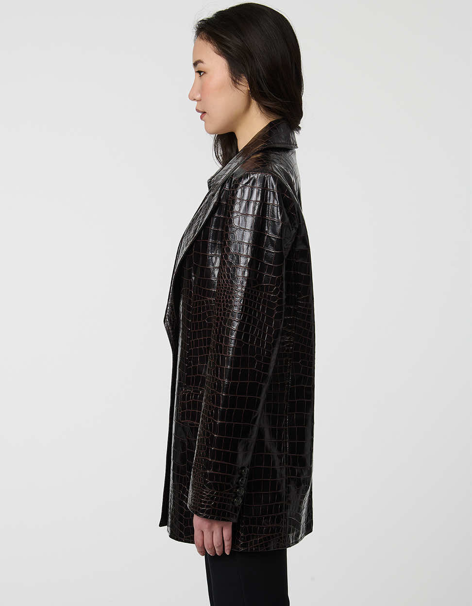 Sleek structure, bold texture. The Langston thigh-length blazer is crafted from rich faux crocodile leather with polished lapels, flap pockets, and a clean, single-breasted front. Classic fit and timeless design—tailored to turn heads.