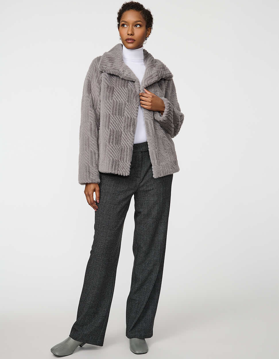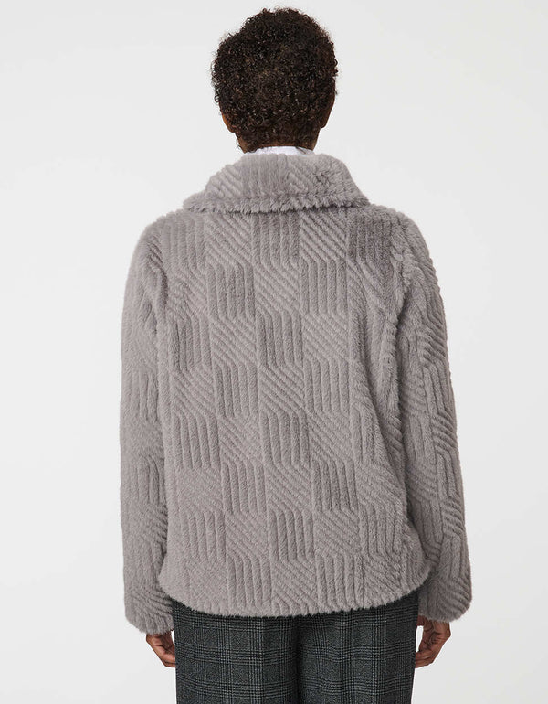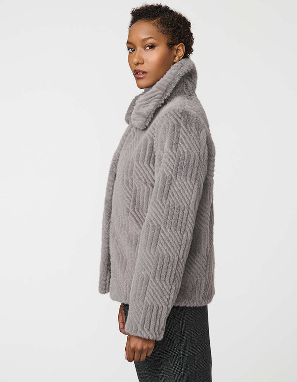 Indulge in the luxurious feel of this faux fur jacket. The Lennox Faux Fur Jacket features soft square-patterned faux fur, snap buttons, and a stand collar. A classic fit and elegant finish make this coat ideal for elevating cold-weather style.