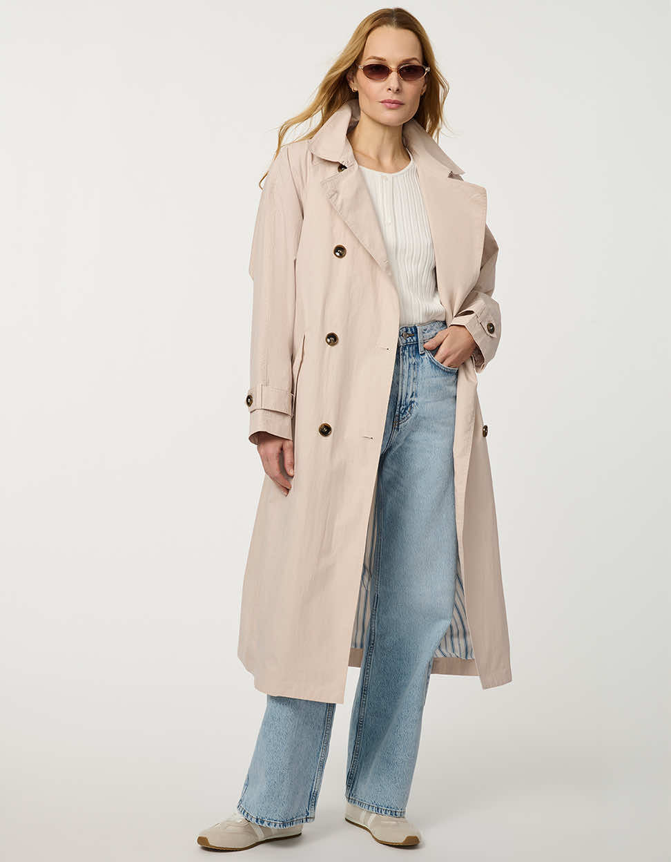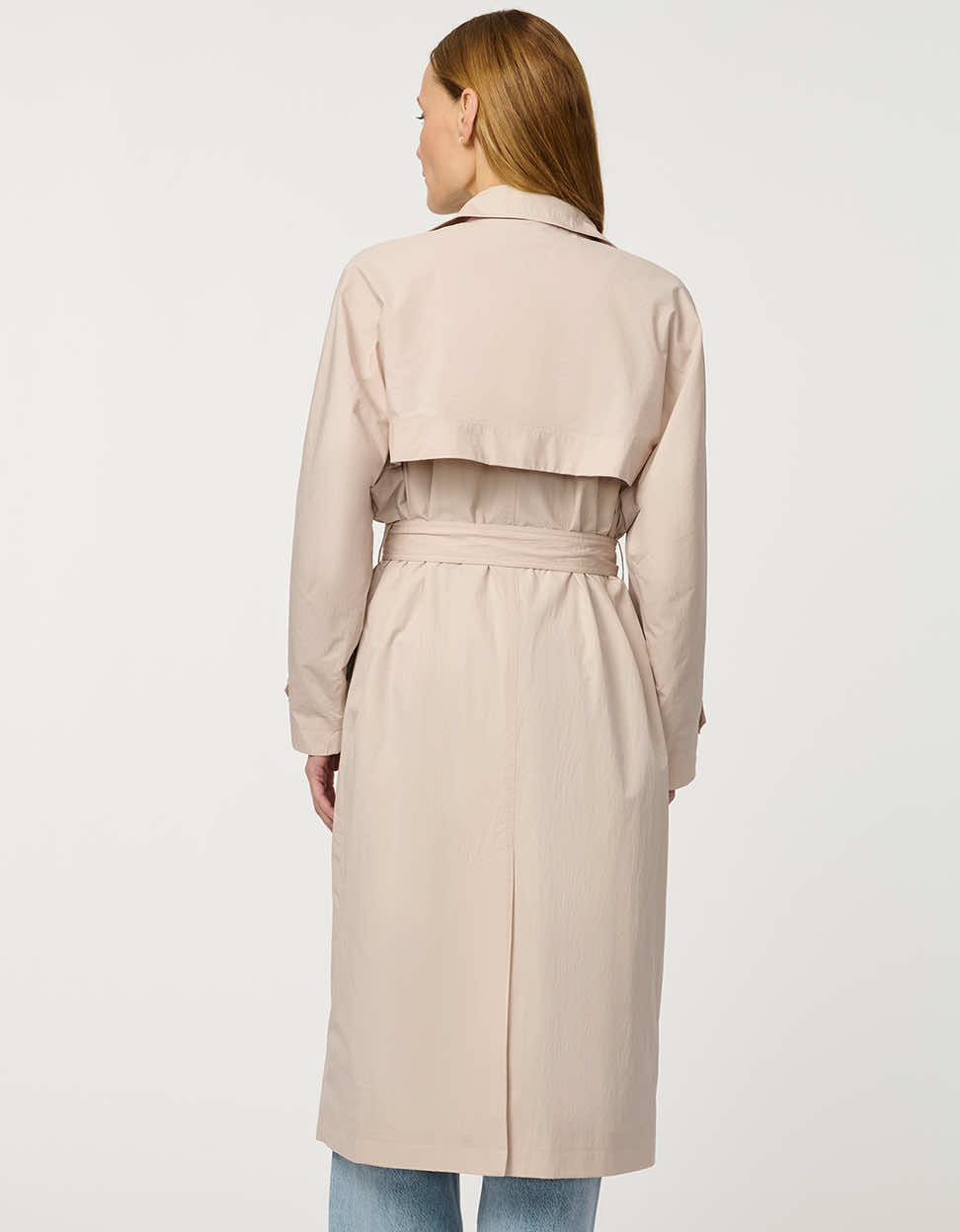 A timeless trench coat designed for the modern woman. The Belmont Double-Breasted Trench features relaxed sophistication. The double-breasted silhouette has a softly structure shape with a belted waist for a refined shape, making it a wardrobe essential for spring layering and polished everyday wear. Inside, a striped interior lining adds a subtle, unexpected detail—bringing a touch of flair. Finished with classic cuff tabs and lightweight construction, this trench is equal parts polished and practical, offering versatility for everyday wear, travel, and changing weather.