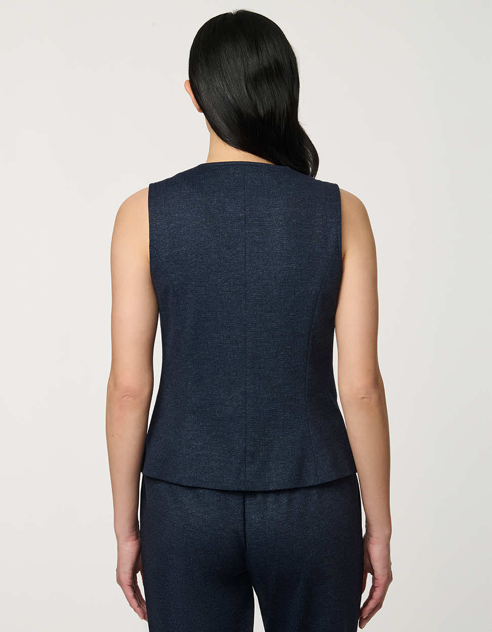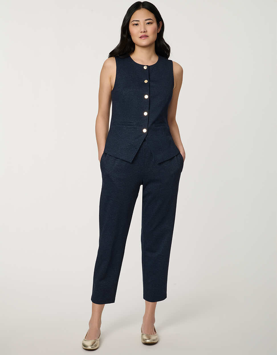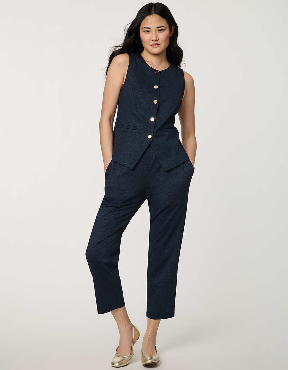 Shop The CollectionA modern take on tailored dressing, the Button Down Crew Neck Vest delivers clean lines with effortless structure. Designed with a softly contoured silhouette and refined button-front detailing, this sleeveless style offers versatility without sacrificing polish. The hue adds depth while maintaining seasonless appeal. Wear it on its own for a confident, minimal look or pair with the matching Slim Drawstring Pant.