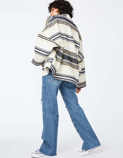 Indoor outdoor layer with retro stripes and soft shoulders on an open, shawl-neck silhouette.