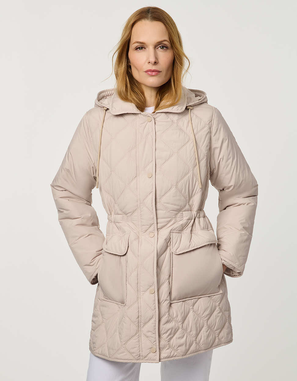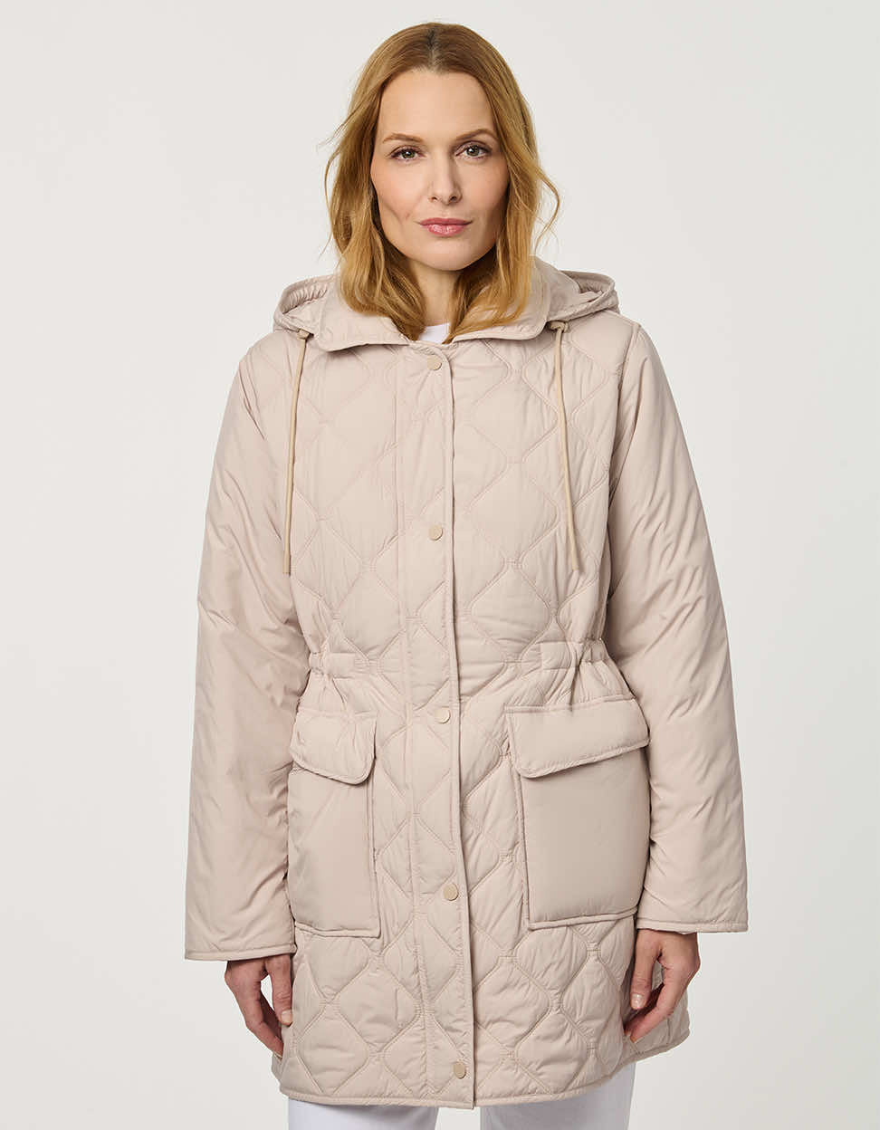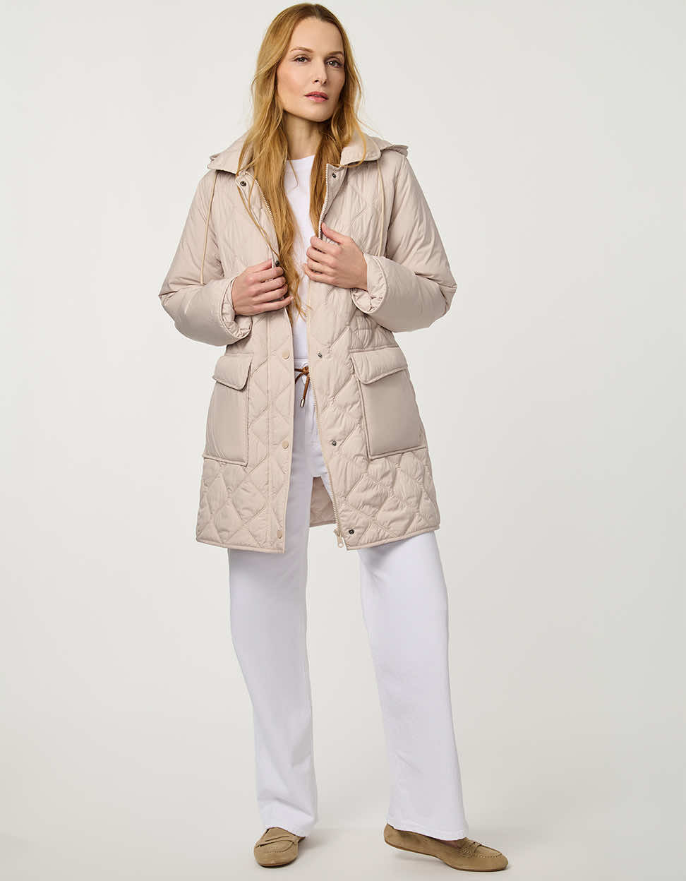 A utilitarian-inspired quilted jacket with a modern sophistication. The Crest Quilted Utility Jacket features functional thoughtfully designed details include functional flap pockets, a front snap closure, and an attached hood for added coverage on cooler days. A drawstring cinched waist offers a customizable flattering shape while maintaining comfort and ease of movement. This effortless jacket is an easy layering piece for transitional spring days.