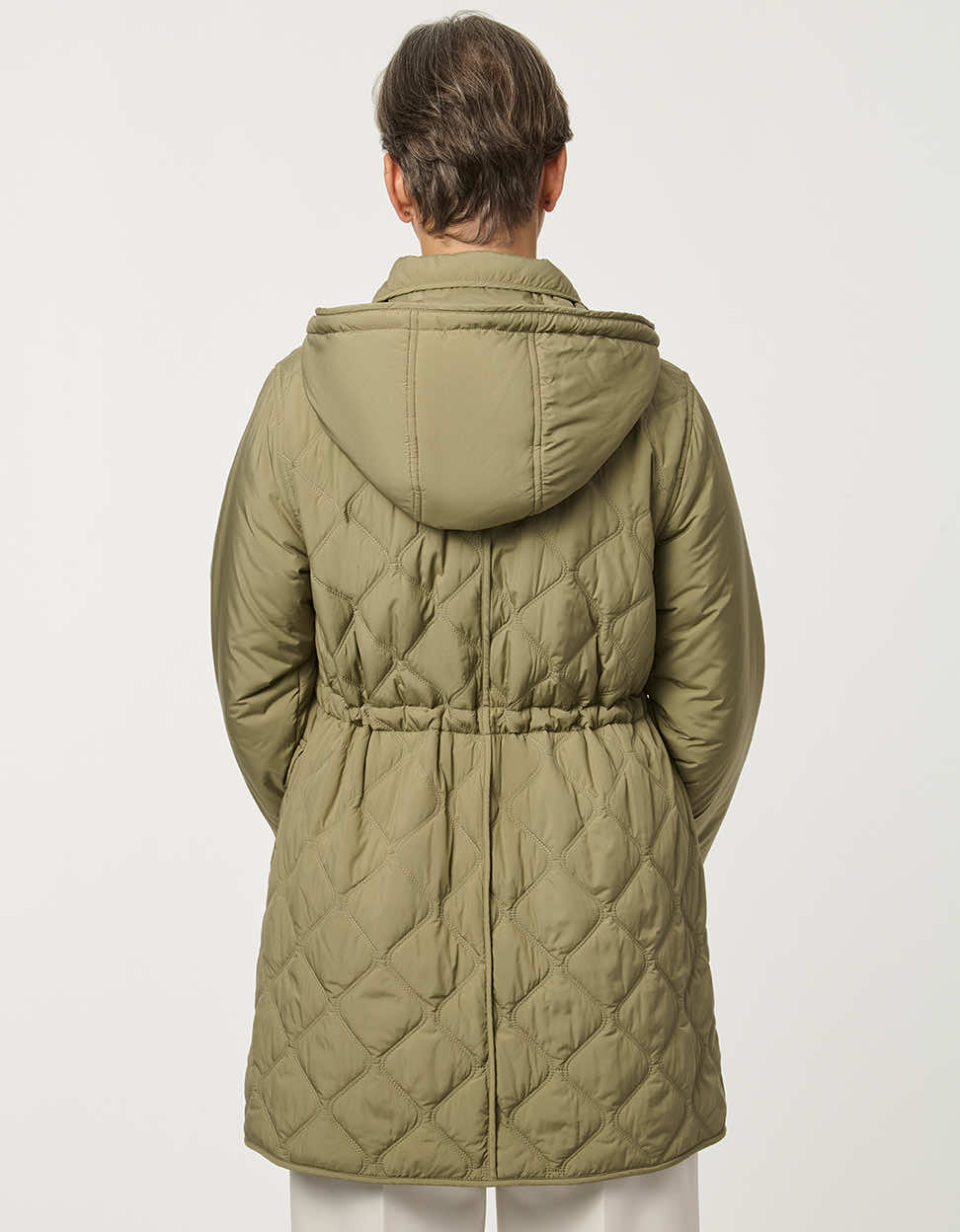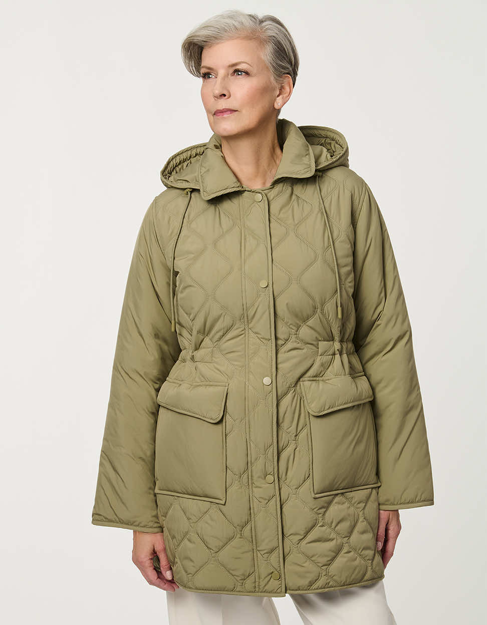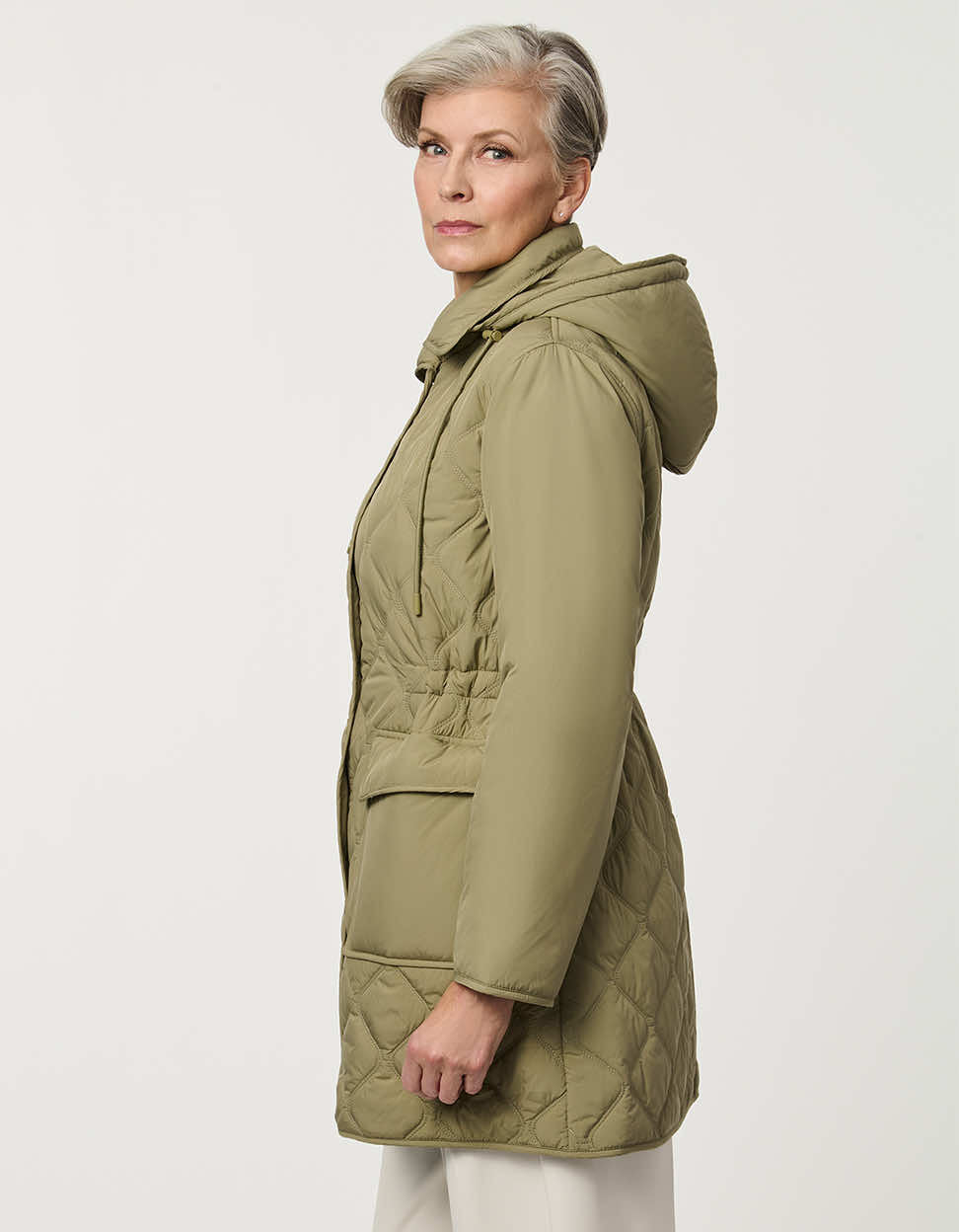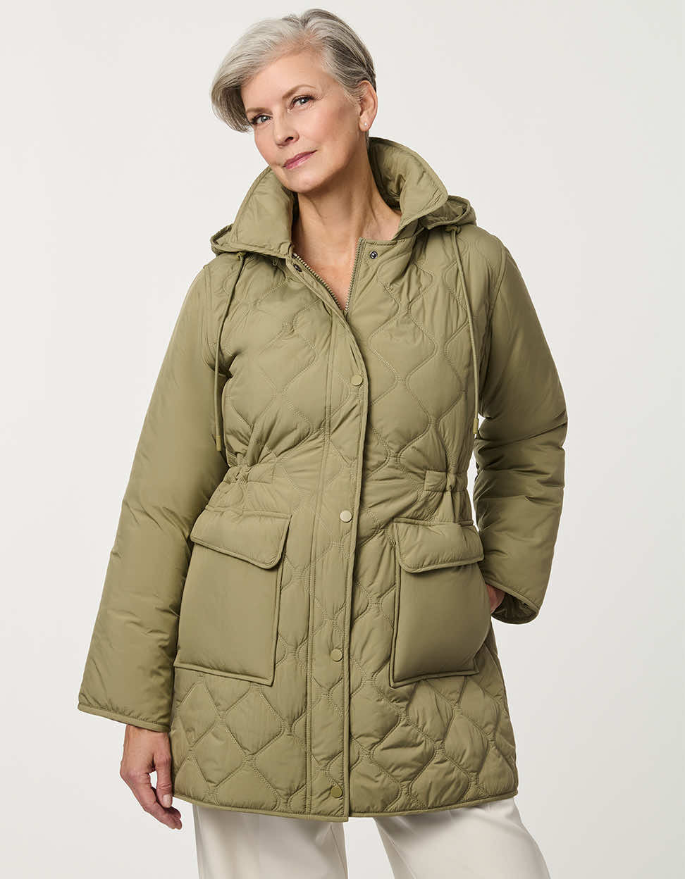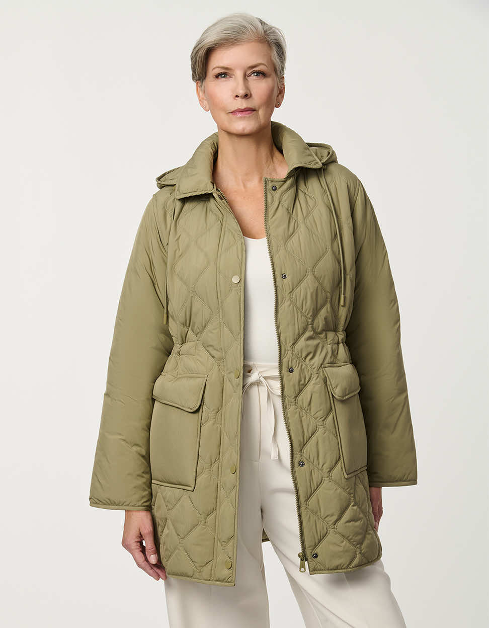 A utilitarian-inspired quilted jacket with a modern sophistication. The Crest Quilted Utility Jacket features functional thoughtfully designed details include functional flap pockets, a front snap closure, and an attached hood for added coverage on cooler days. A drawstring cinched waist offers a customizable flattering shape while maintaining comfort and ease of movement. This effortless jacket is an easy layering piece for transitional spring days.