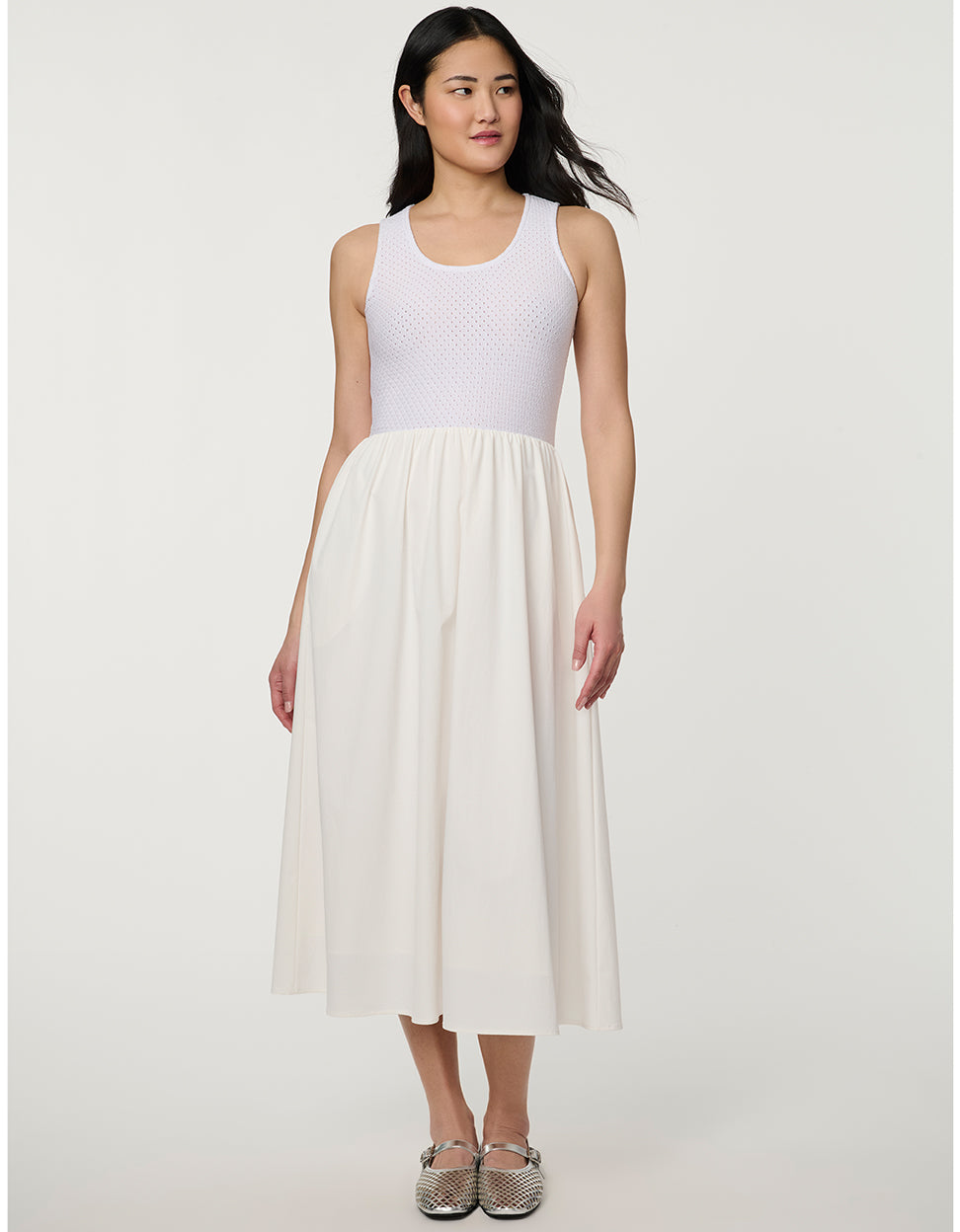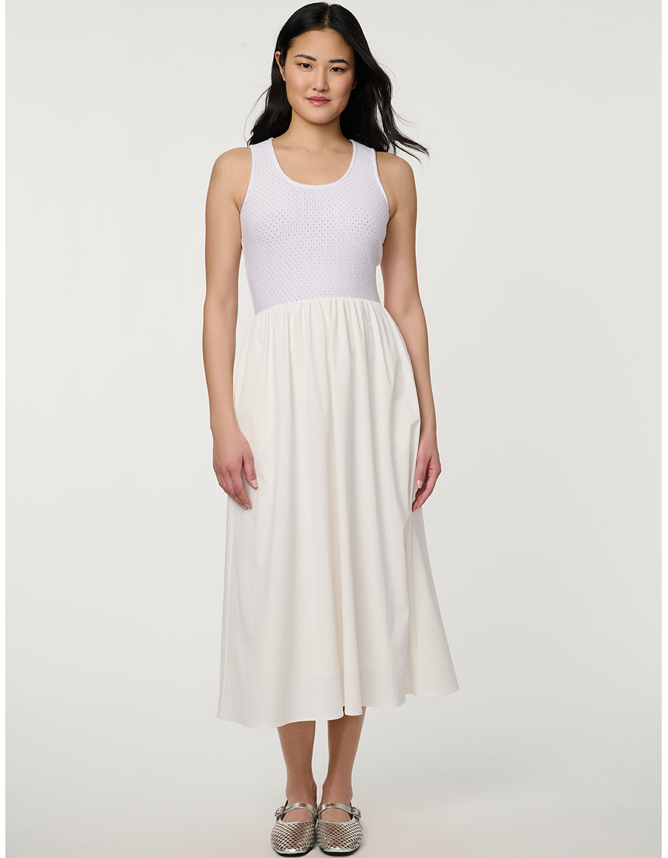 The Eyelet Midi Dress blends modern staple for effortless spring and summer dressing. Designed with a soft knit eyelet bodice, this women’s white midi dress features subtle perforated detailing that adds breathable comfort and visual dimension. The fitted tank-style top transitions into a fluid, A-line midi skirt, creating a flattering silhouette that moves effortlessly with the body. Perfect for warm-weather occasions, vacation dressing, or refined everyday wear, this lightweight white midi dress offers polished versatility with contemporary ease.