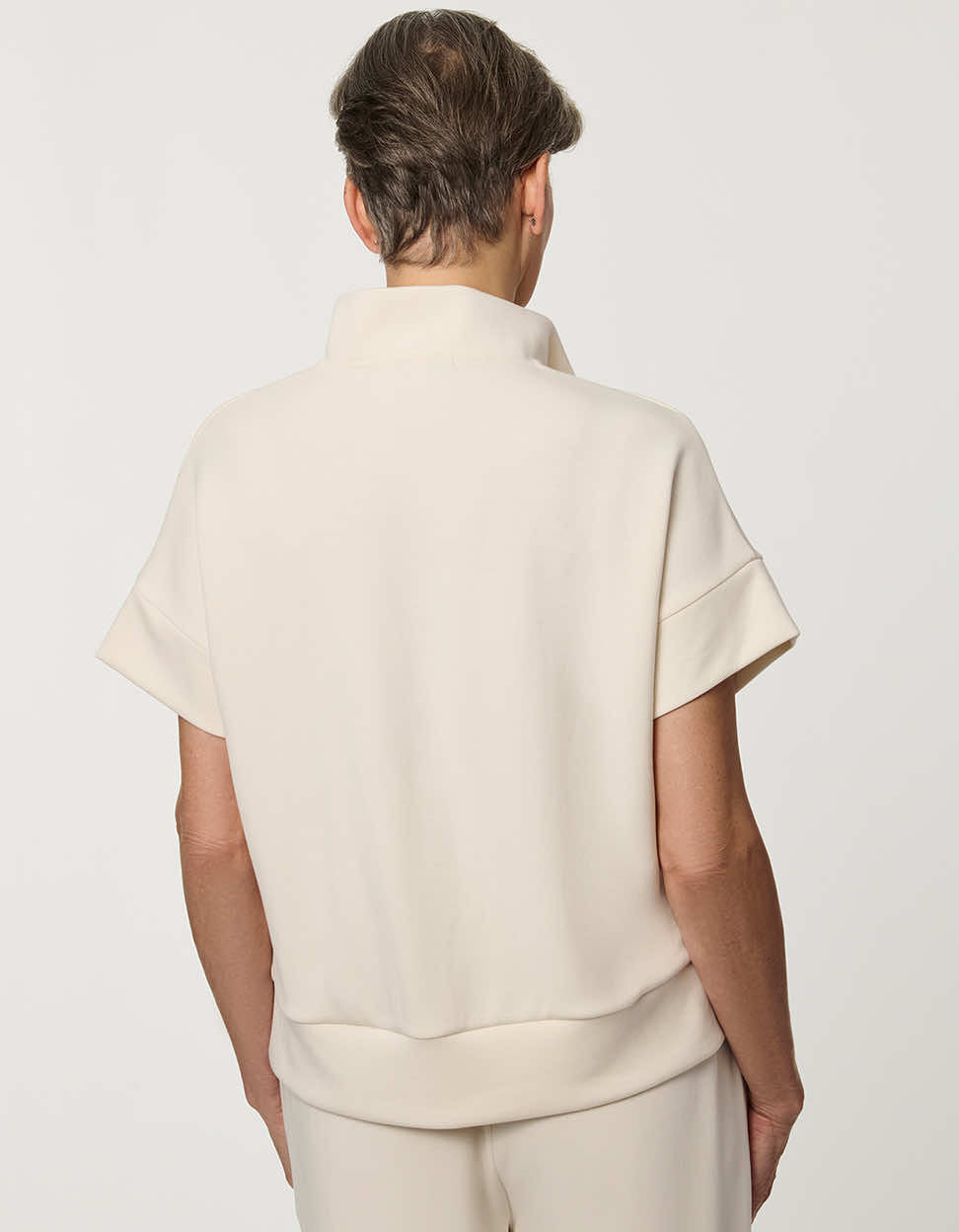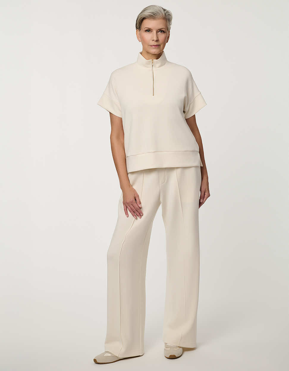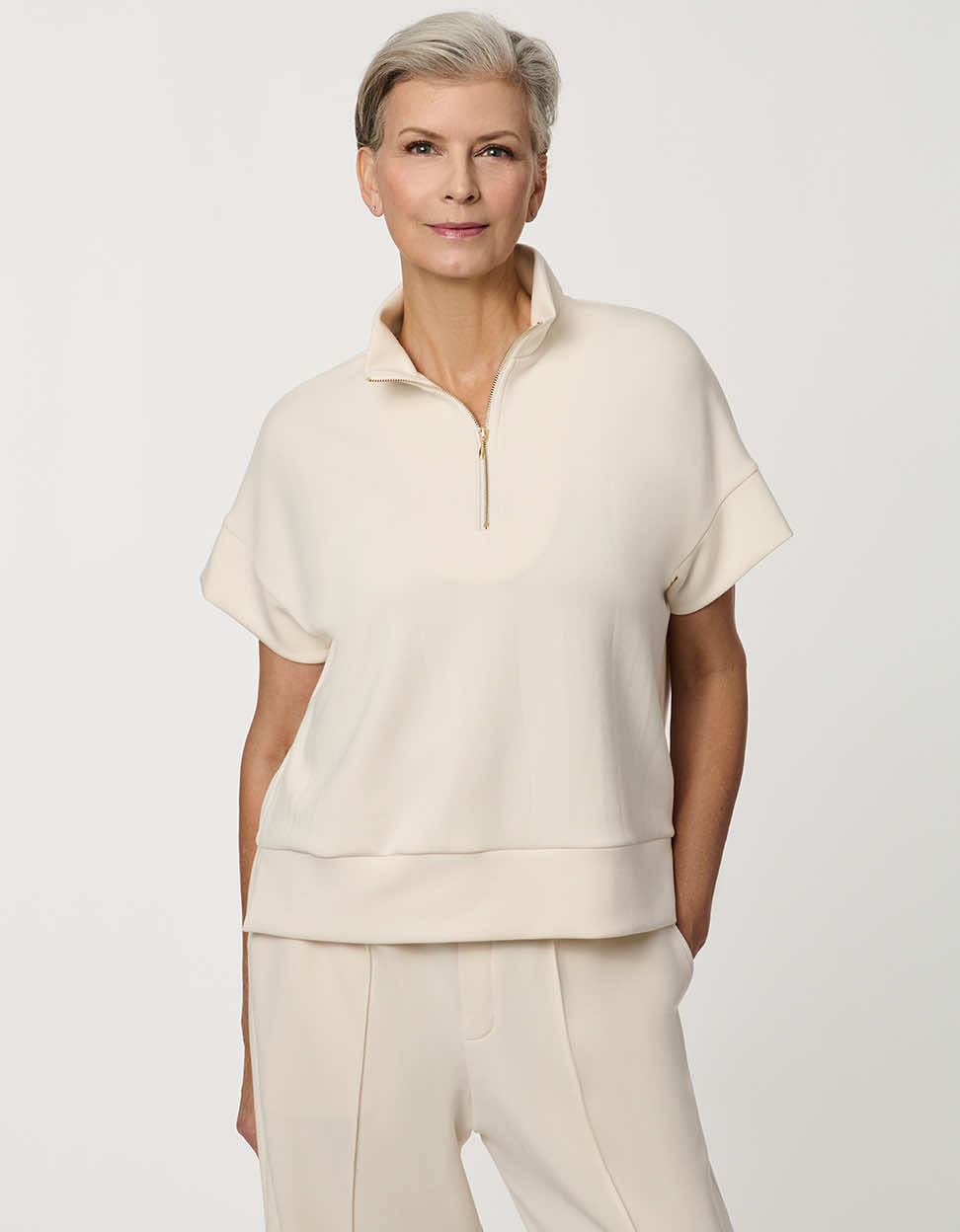 Refined comfort meets modern structure in the Half-Zip Scuba Pullover Top. Designed in a smooth, super-soft scuba fabric, this women’s short-sleeve pullover offers a clean silhouette with elevated ease. The stand collar and sleek half-zip neckline add contemporary polish, while the relaxed fit and subtle drop-shoulder construction create effortless drape. Perfect for travel outfits, elevated loungewear, or modern off-duty styling, this structured scuba top pairs seamlessly with the coordinating Scuba Pull-On Wide-Leg Pant for a polished matching set that feels as comfortable as it looks.