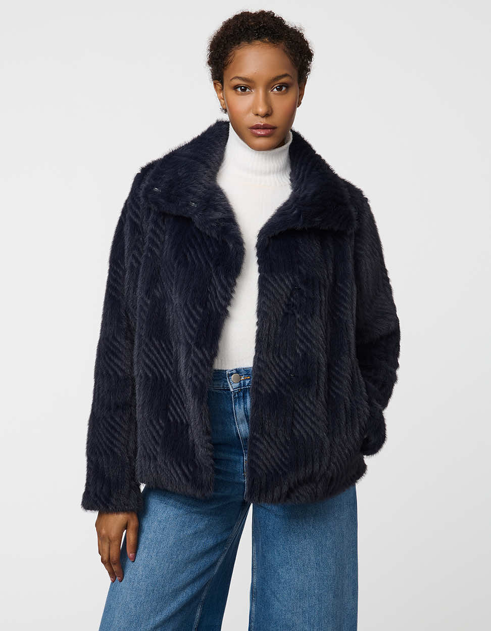 Indulge in the luxurious feel of this faux fur jacket. The Lennox Faux Fur Jacket features soft square-patterned faux fur, snap buttons, and a stand collar. A classic fit and elegant finish make this coat ideal for elevating cold-weather style.