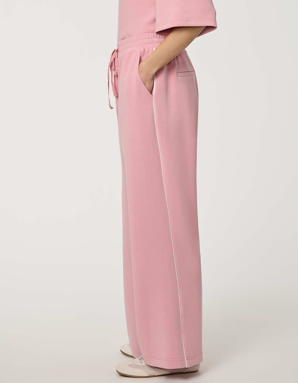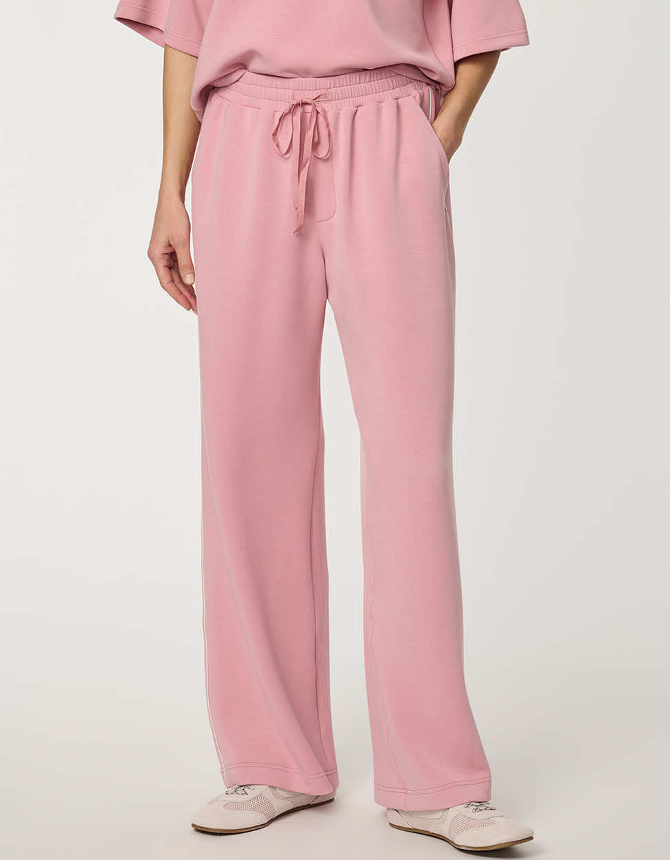 Refined comfort meets modern tailoring in the Scuba Pull-On Pant with Piping. Crafted from smooth, structured and supersoft scuba fabric, this women’s wide-leg pull-on pant offers a sleek, elongated silhouette with effortless wearability. The elastic waistband ensures all-day comfort, while subtle piping detail enhances the clean, tailored finish. Perfect for travel, work-from-anywhere days, or elevated off-duty dressing, this wide-leg scuba pant delivers structure without restriction. Pair it with the Relaxed Scuba Drop-Shoulder Tee for a polished matching set.