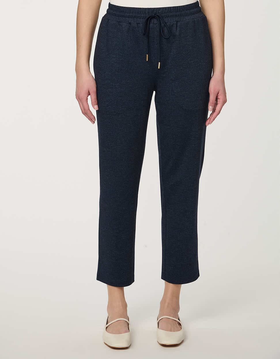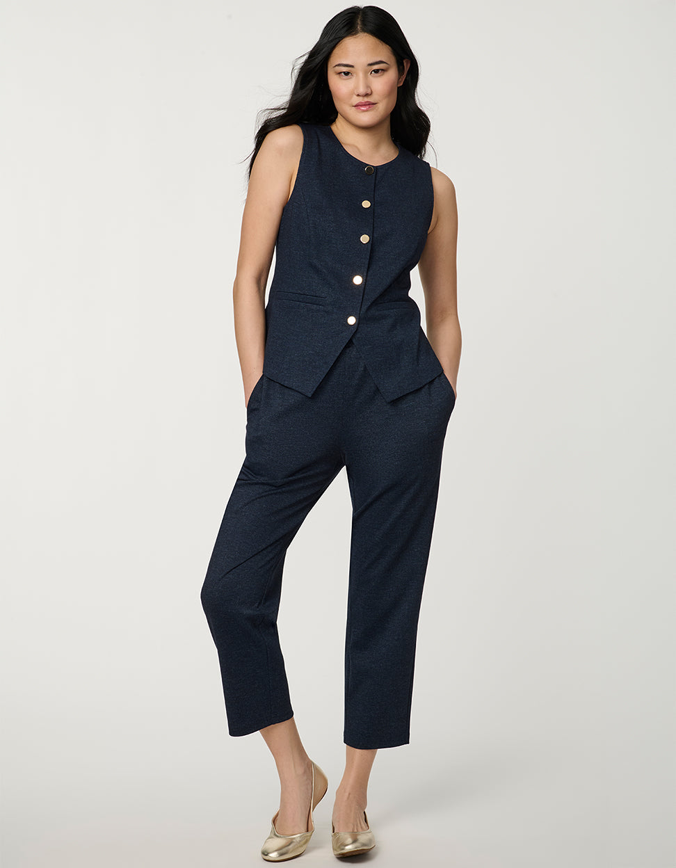 Refined tailoring meets everyday ease in the Slim Drawstring Pant. Designed with a flattering straight-leg silhouette and a comfortable drawstring waist, this style offers polished structure with relaxed functionality. The cropped length adds a modern touch, making it ideal for styling with flats or sleek sneakers. Featuring a fabric that gives the appearance of classic denim, the finish offers the rich depth and texture of denim but with a softer, more lightweight hand feel. Crafted to move seamlessly from work to weekend, it’s the foundation of effortless dressing. Pair with the Button Down Crew Neck Vest for a polished look.