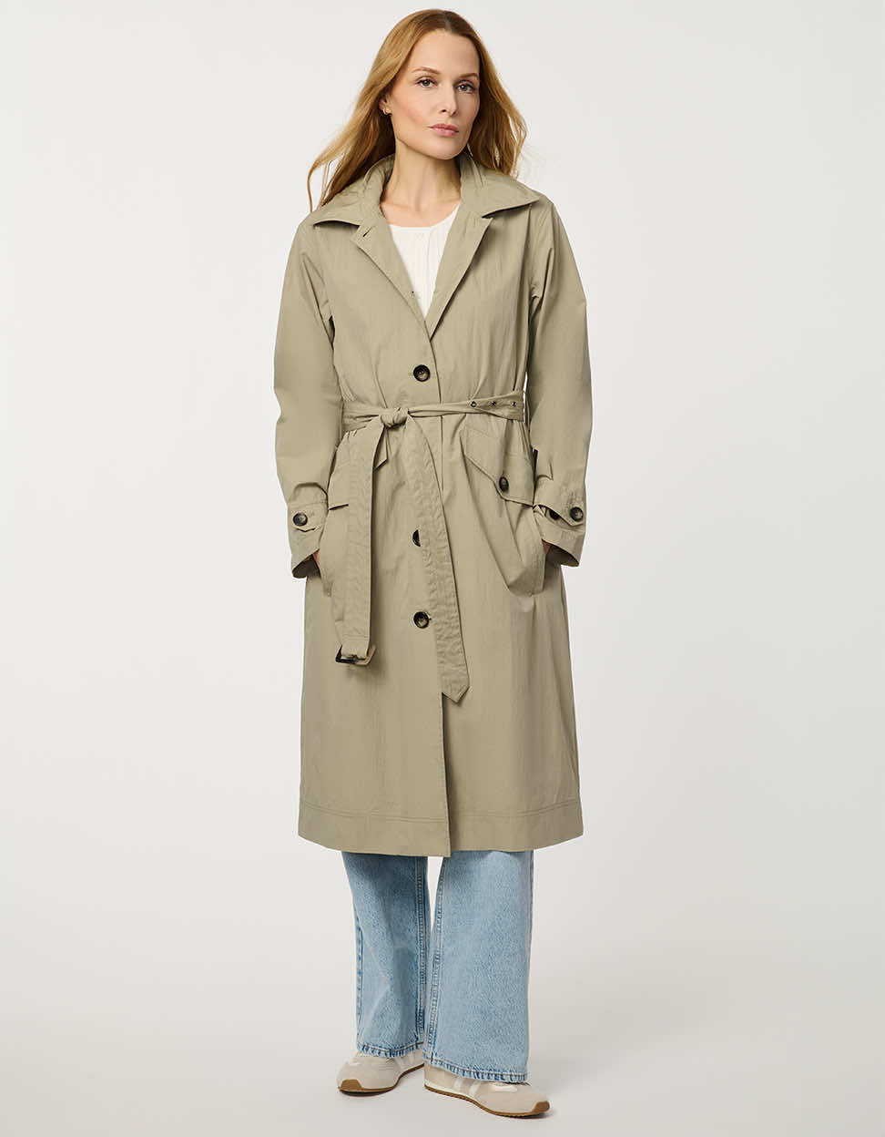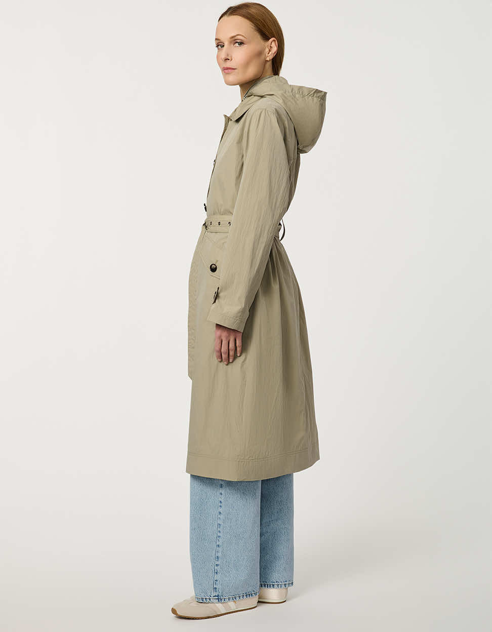 A timeless trench coat designed for modern versatility. The Slone Utility Trench is a refined silhouette featuring a clean, elongated shape with a flattering belted waist that allows for a customizable fit. Flap pockets add both function and subtle structure. A hidden roll-away hood tucks into the collar, offering added protection when needed. Finished with classic button details at the cuffs and a lightweight feel ideal for transitional weather, this trench moves effortlessly from everyday wear to travel-ready layering.