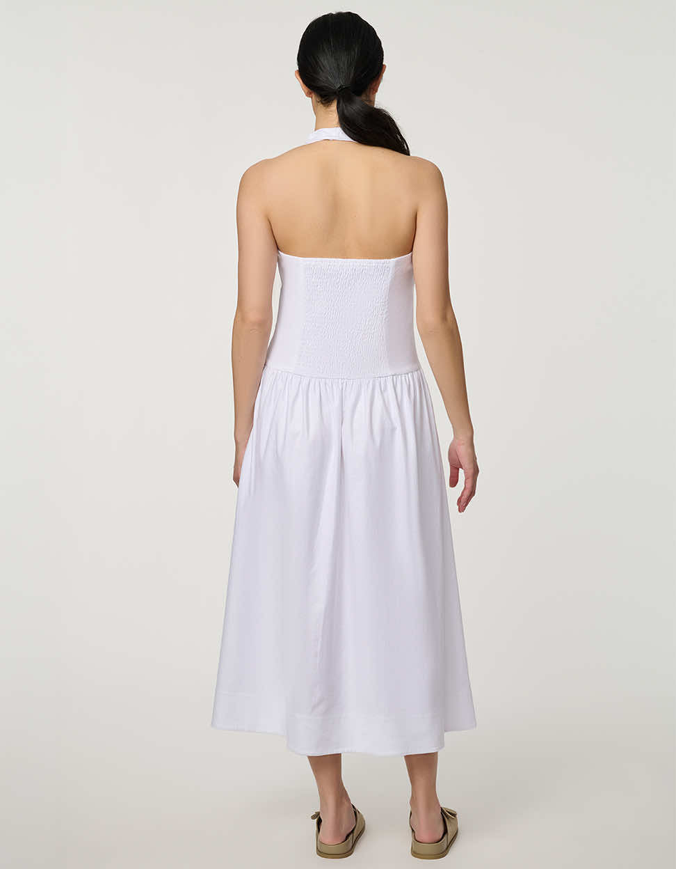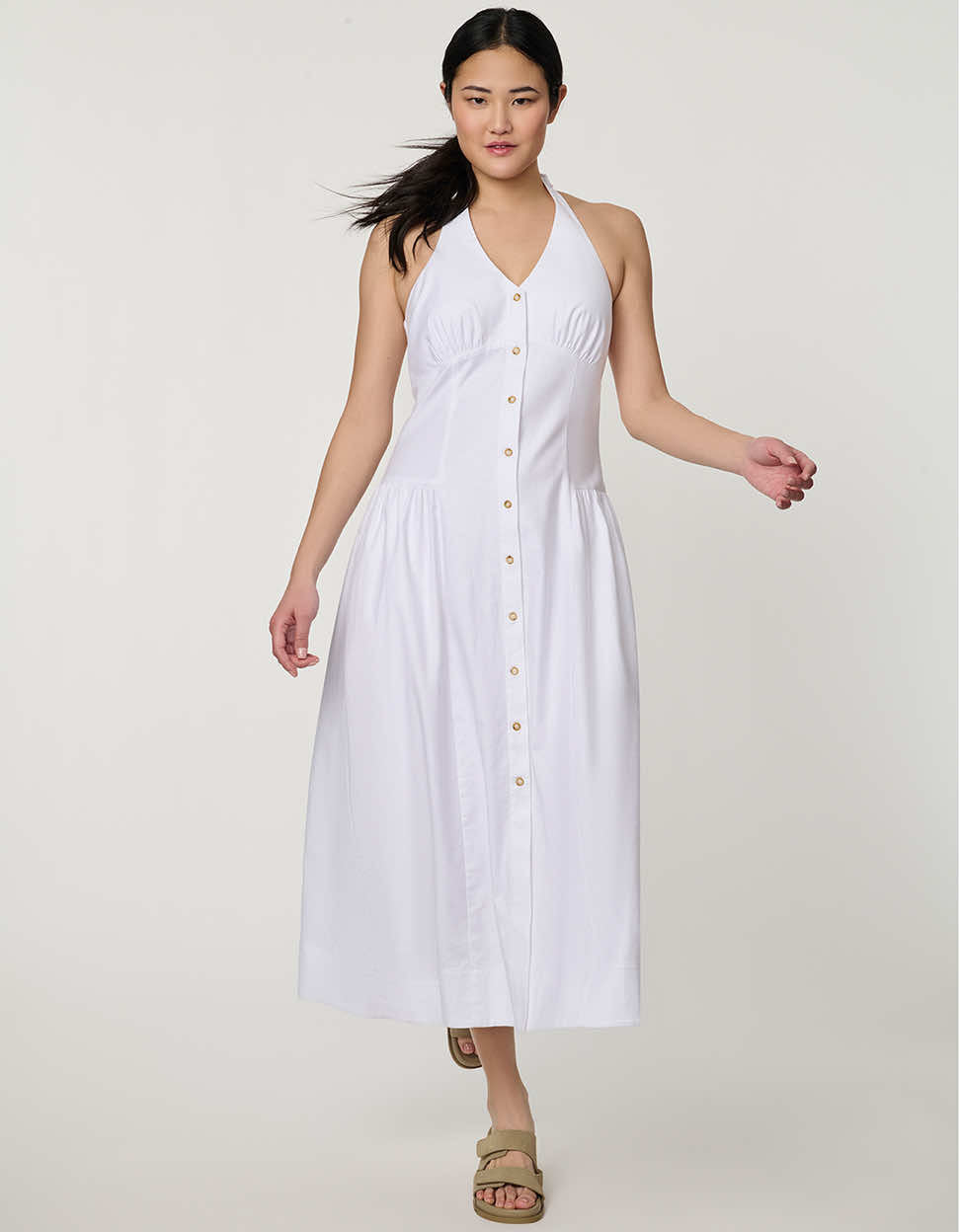 Elevate warm-weather dressing with the Stretch Linen Halter Dress, a modern women’s linen midi dress designed for effortless spring and summer style. Crafted from breathable stretch linen, this lightweight white halter dress offers natural texture, soft structure, and a flattering, fluid silhouette. The halter neckline and full button-front detail add refined polish, while side pockets provide everyday functionality. Perfect for vacation dressing, summer events, or elevated daytime wear, this versatile linen dress blends timeless elegance with modern ease.